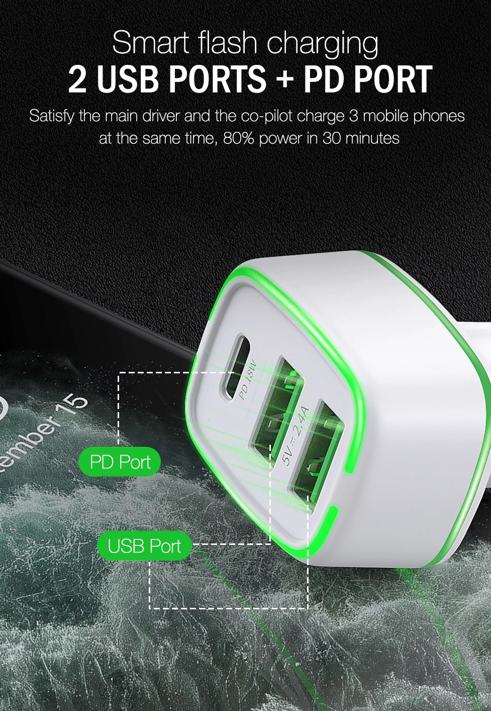 Made of hard plastic, small-size compact, USB + PD Car charger with LED indicator, which makes it convenient to find exactly where the connection should go in the dark.