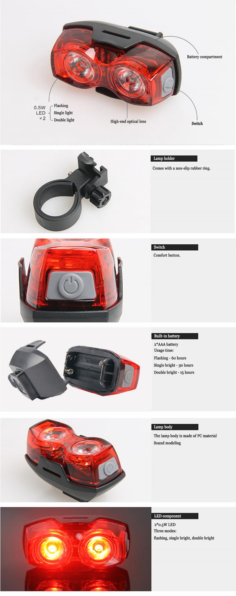 Keep yourself and your loved ones with this Dual LED 3 mode waterproof bicycle tail light. The dual LED feature give keeps you visible and safe during night. And wide angle light beams over 250 degrees.