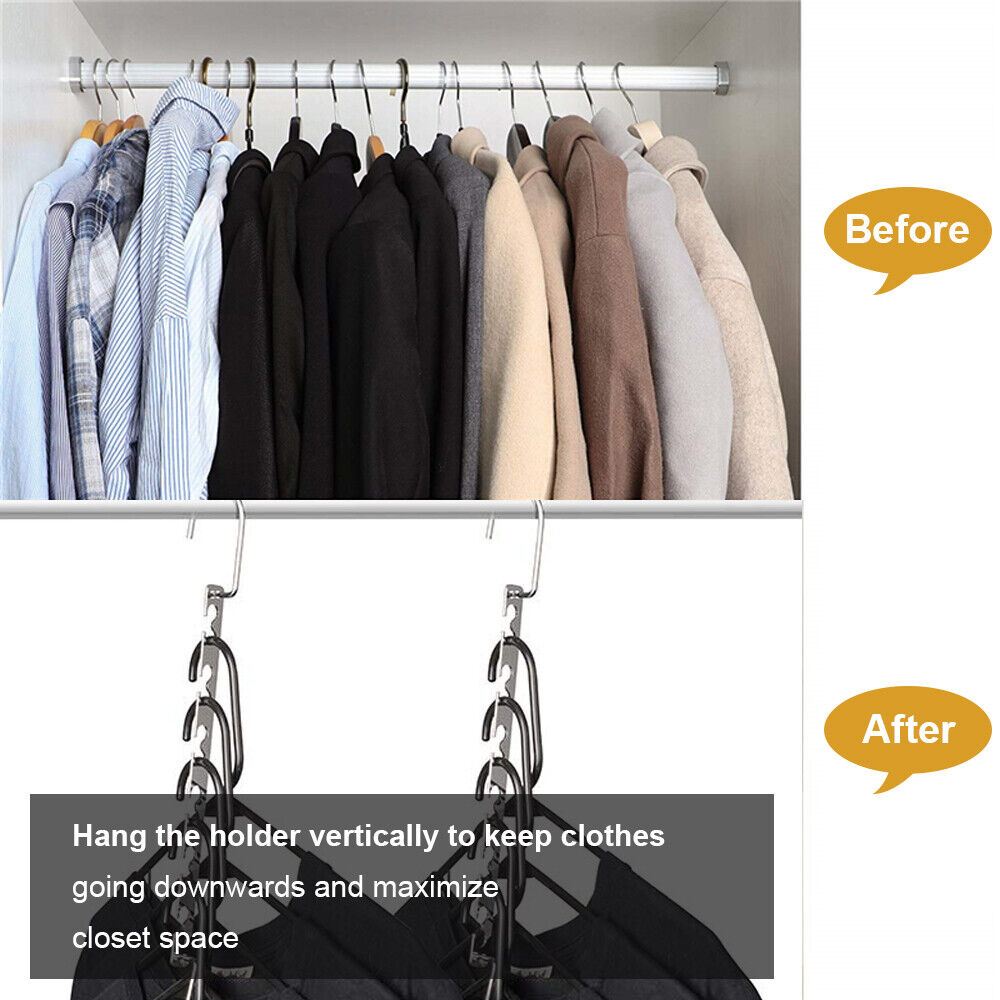Introducing the 6x Space Saver Hanger Saving Wonder Metal Magic Hanger Clothes Closet Organise Hook – your ultimate solution for optimizing closet space and keeping your wardrobe impeccably organized. Crafted with innovation and practicality in mind, this hanger is a game-changer for any closet. Designed to maximize space utilization, magic hanger can save up to 80% of your wardrobe space while ensuring your clothes remain neat and wrinkle-free. Say goodbye to cluttered closets and hello to efficient storage. Constructed from durable chrome-plated metal, this magic hanger is built to last, offering robust support for your garments. Each magic hanger features six wavy slots to prevent clothes from slipping, providing added security and stability.